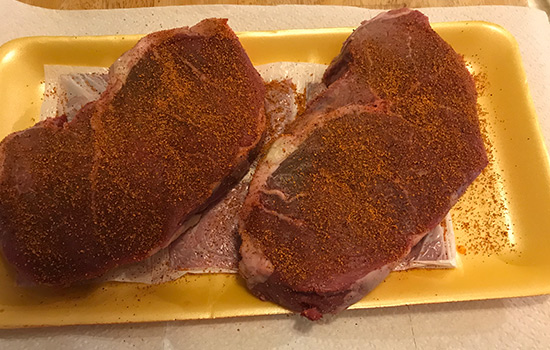 Mix all of your dry seasonings together, it really doesn’t matter here as long as salt and pepper are involved….and you really can’t go wrong with most pre mixed rubs either but keep in mind a good steak really doesn’t need anything other than salt and pepper. Rub the seasoning on the steak and let sit until it’s no longer cold, probably about an hour.